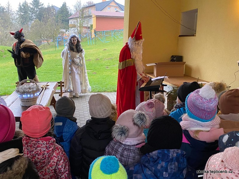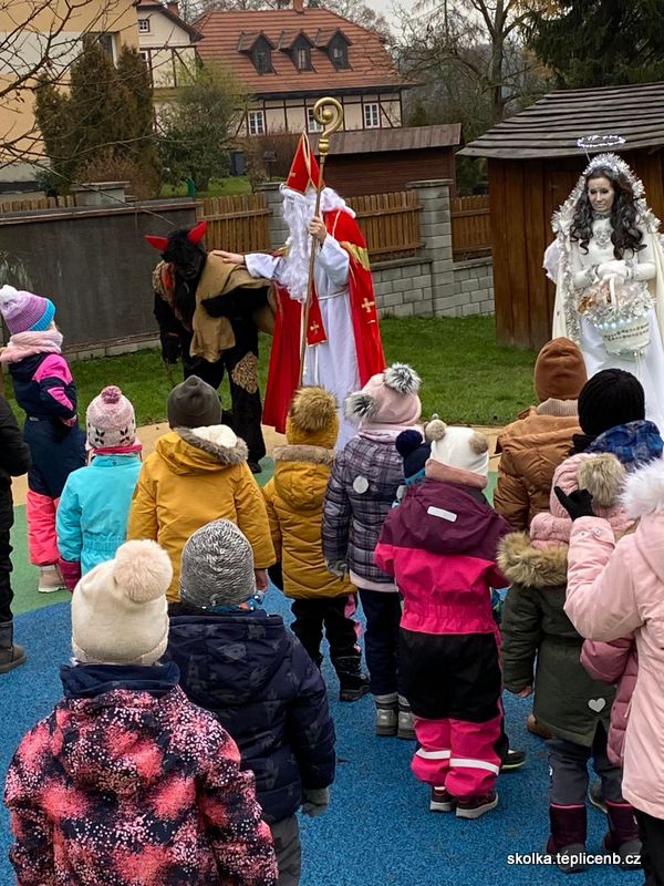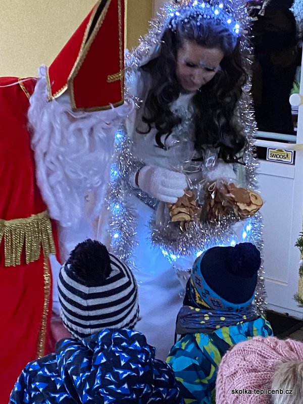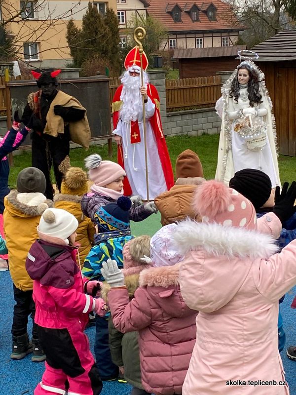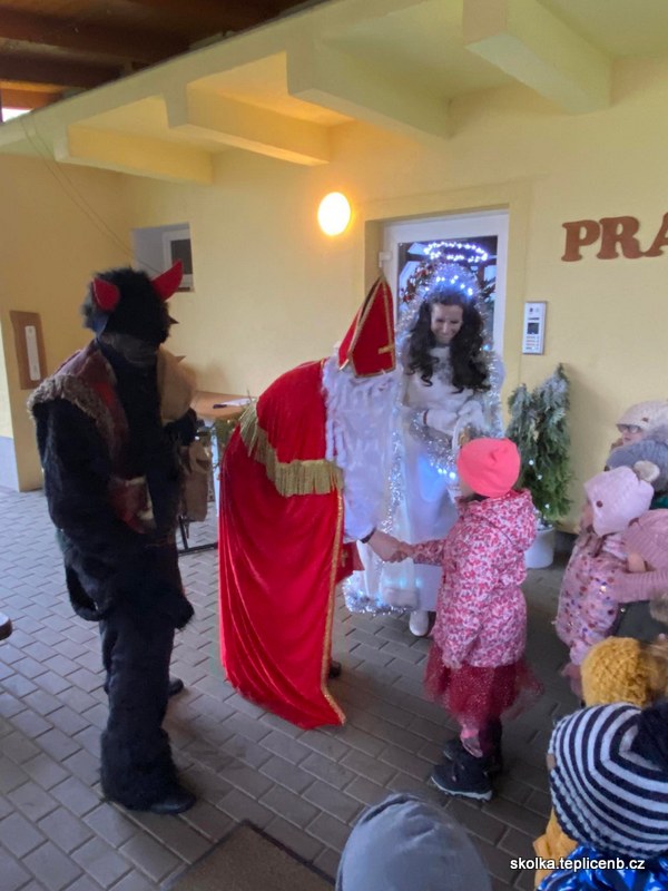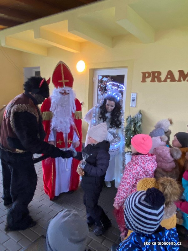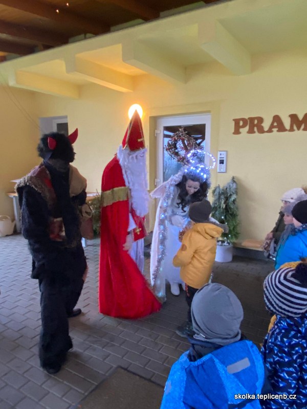Dne 5.12.2022 zavítal do naší školky Svatý Mikuláš, umouněný čert a sněhově bílý anděl. Děti předvedly pásmo písní a básní a odnesly si sladkou odměnu v podobě perníčků a sušených jablek.