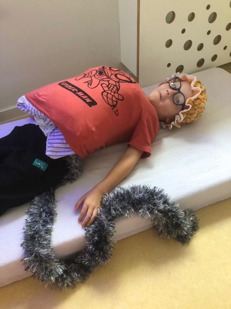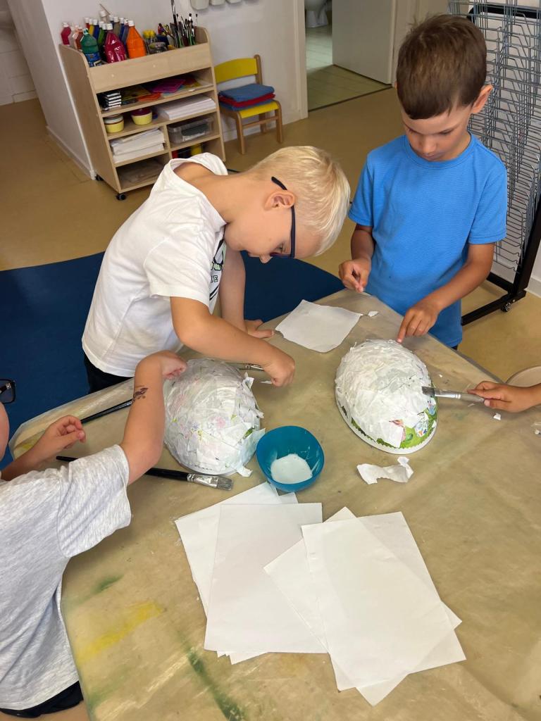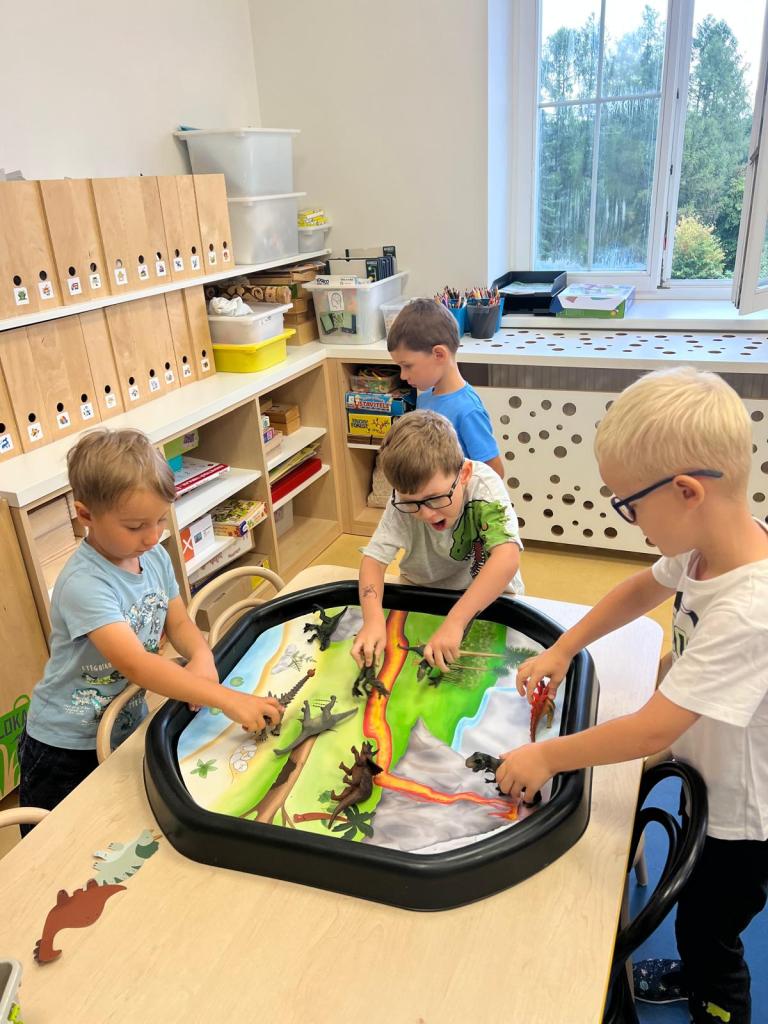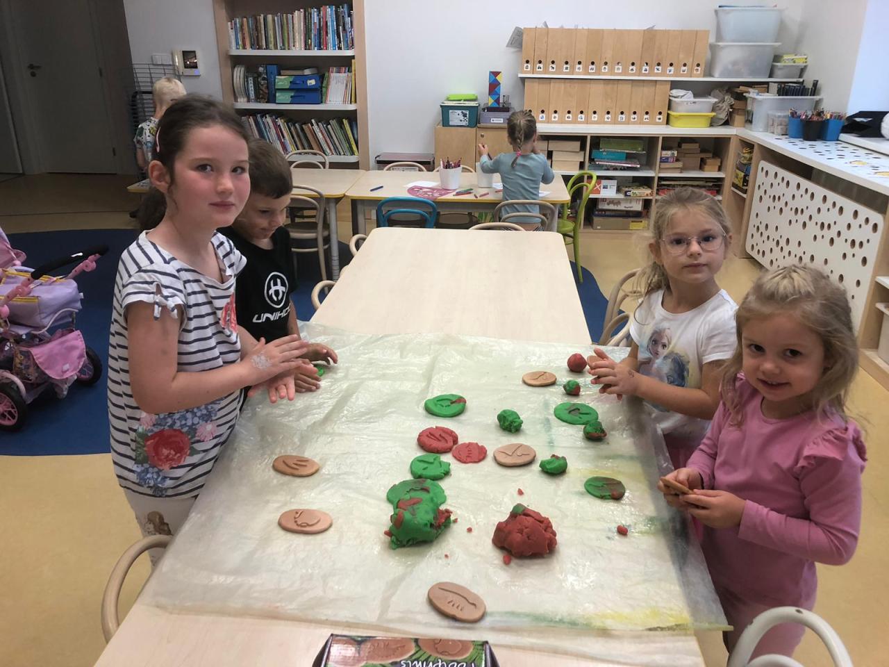 Děti hledaly po třídě stopy, třídily je podle otisku a počítaly. Polepili jsme si velké dinosauří vejce a mohli jsme si poskládat dinosauří kosti a 3D puzzle dinosaura.