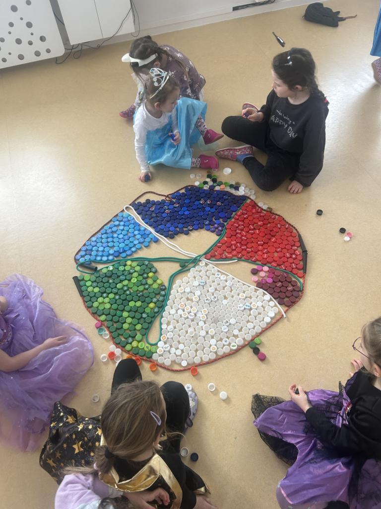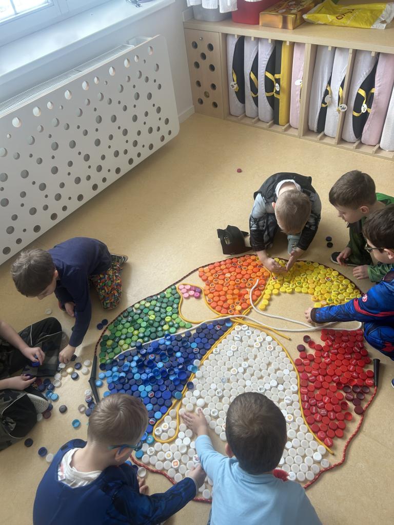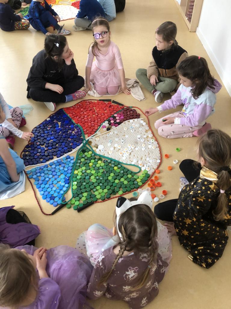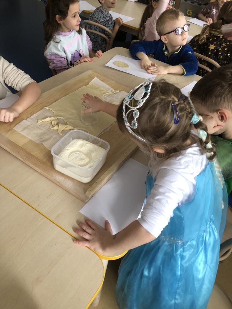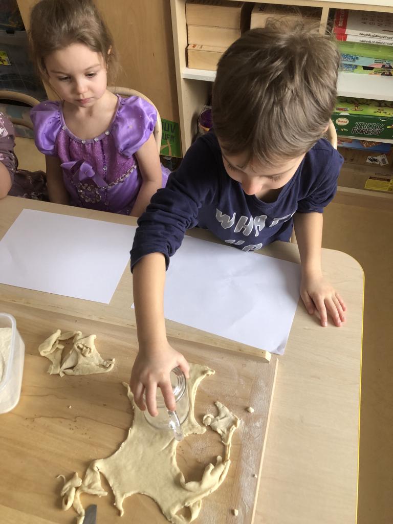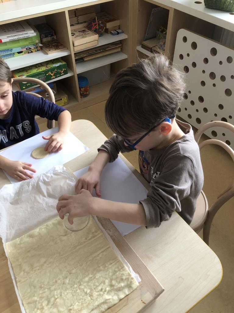 V rámci předmatematických dovedností jsme koláče dělili do zlomků-polovina, čtvrtina, šestina, osmina a pomocí PET vršků jsme zdobili koláče ve třídě.