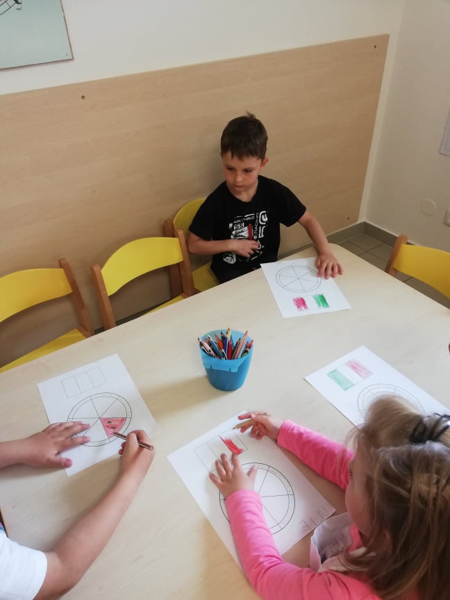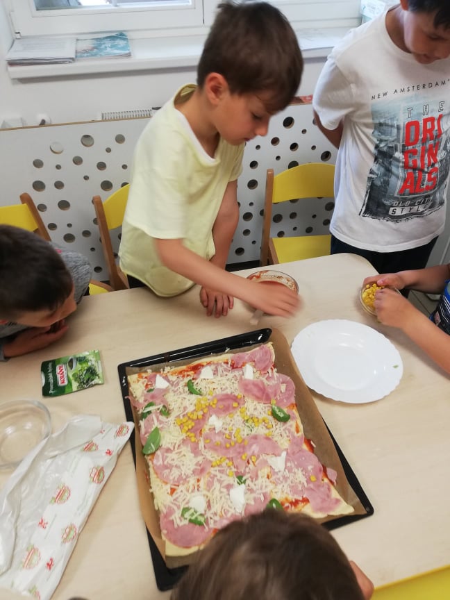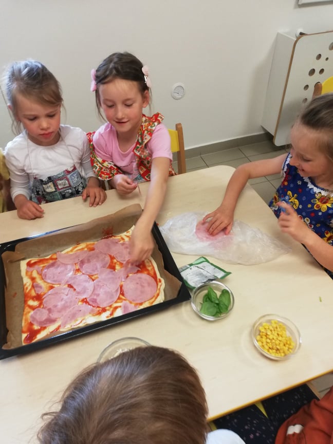 Rozdělili jsme se na dva týmy a každý měl svého šéfkuchaře, jež zadával úkoly. Děti se rolí zhostily zodpovědně a práce jim šla od ruky. Využili jsme základní ingredience a zjistili jsme, že pizza byla původně jídlo chudých lidí a na pizzu se dávaly suroviny co dům dal. Netrvalo to dlouho a celou školku provoněla pravá vůně Itálie. Následovalo servírování a závěrečná ochutnávka. Myslím, že náš výrobek byl kvalitní a naši kuchtíci odvedli velký kus práce.