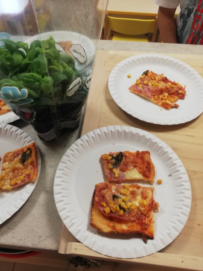 Naše kuchtíky čekala příprava světově proslulého a oblíbeného jídla, jehož kořeny pochází z Neapole v Itálii. Než jsme se vrhli na přípravu pizzy, musely děti uhodnout, jaké jídlo budeme připravovat. Nápovědou byla vlajka Itálie a čerstvá bazalka. Dětem netrvovalo dlouho najít odpověď a vrhli se na přípravu.