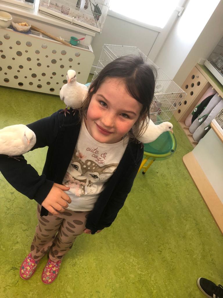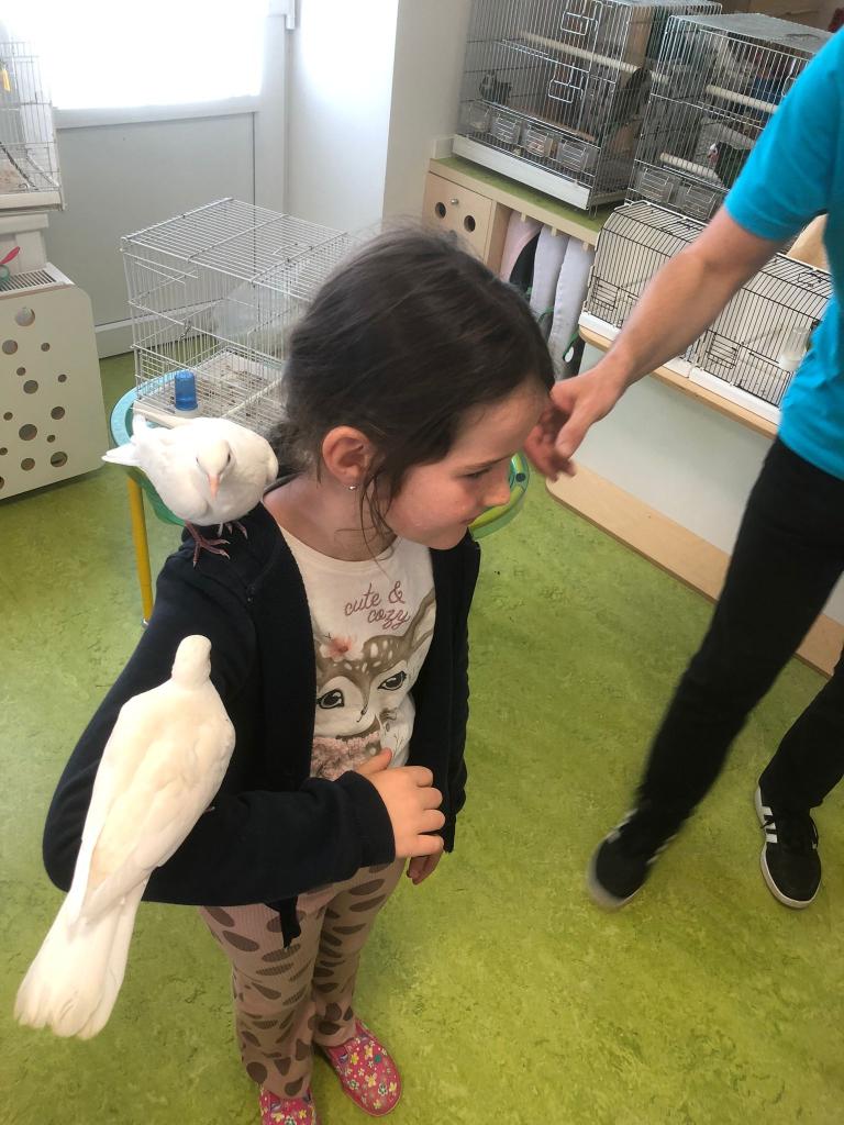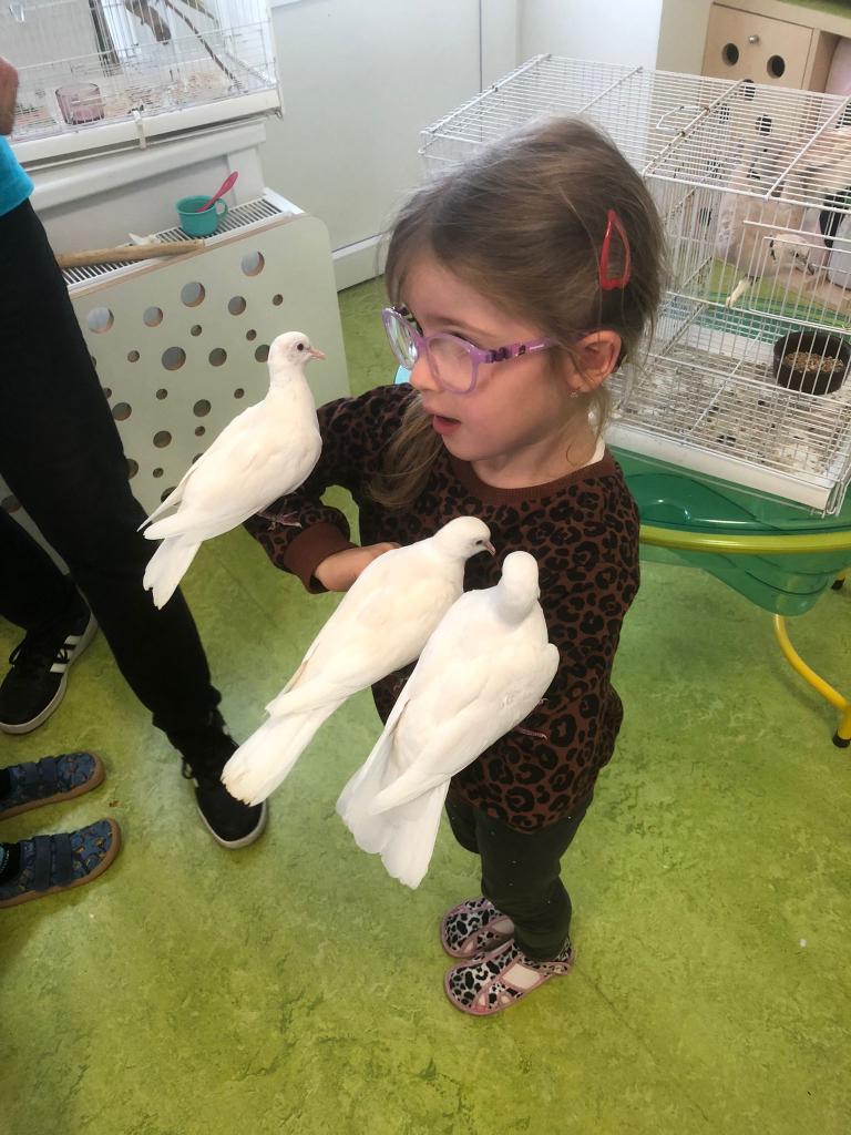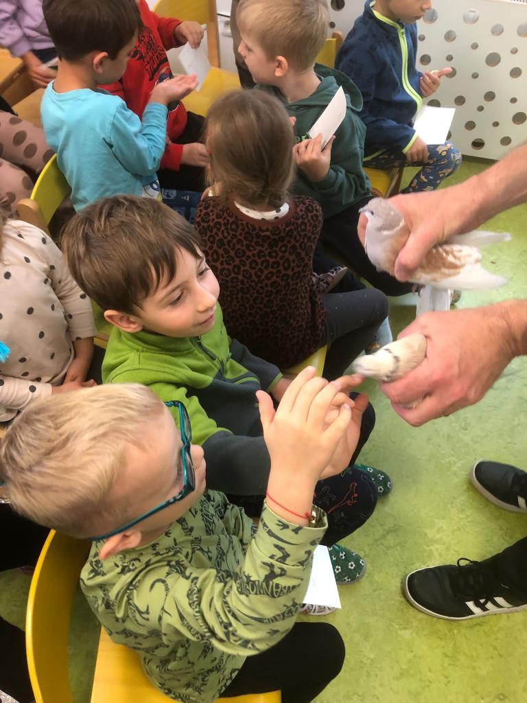 Následně nám promítl fotografie ze svých voliér a klecí, ukázky líhnoucích se mláďat i dalších exotických ptáků, o které pečuje. Na závěr programu si děti mohly pohladit hrdličky chechtavé a nechat je usednout na ruku. Celé povídání pan doktor doplňoval otázkami, za jejichž správné odpovědi děti získávaly odměnu v podobě fotografií ptáčků.