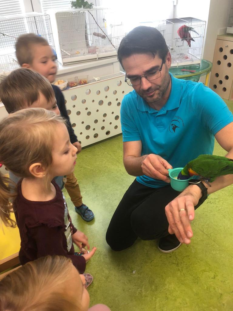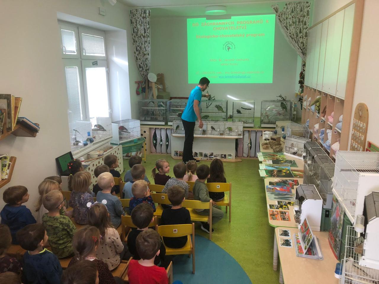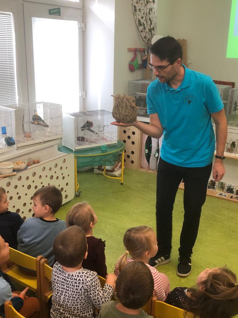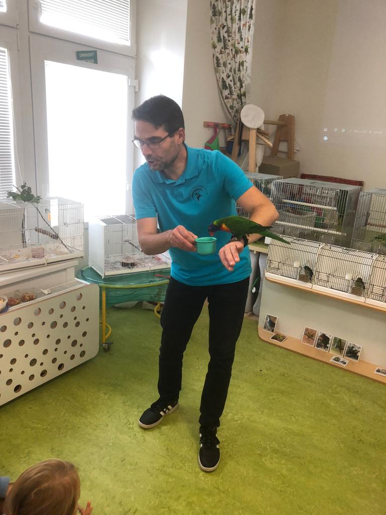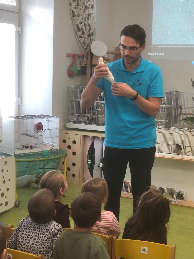 Pan doktor k nám zavítal, aby dětem přiblížil svět převážně exotických ptáků. Na začátku programu nám představil druhy, které přivezl s sebou v klecích – například papoušky, rýžovníky, chůvičky, zebřičky, hrdličky a další. Vyprávěl o jejich způsobu života, potravě, rozmnožování, hnízdění i o zajímavostech z jejich chovu.