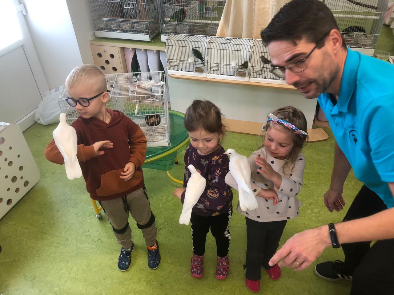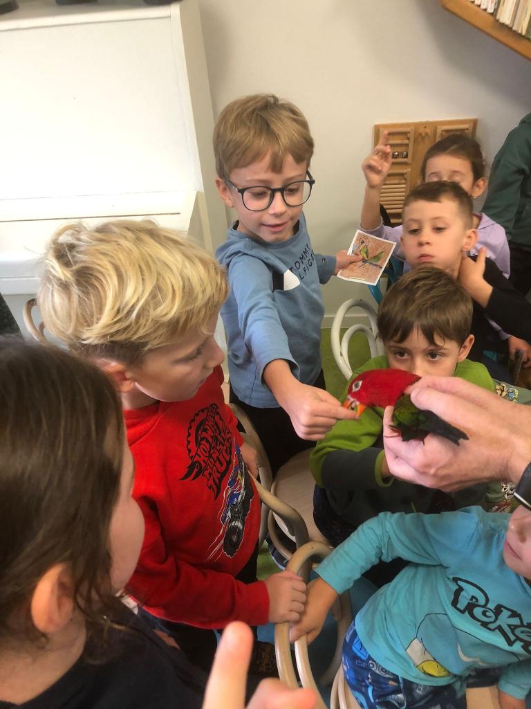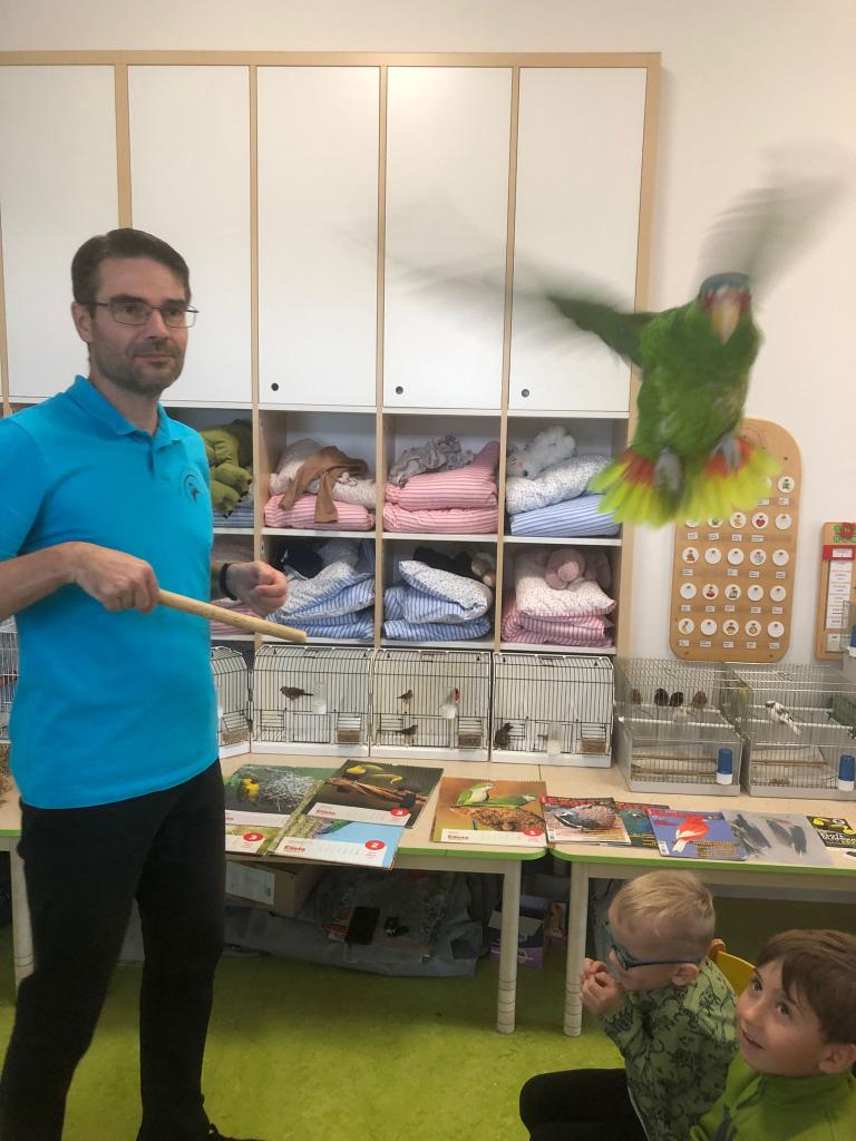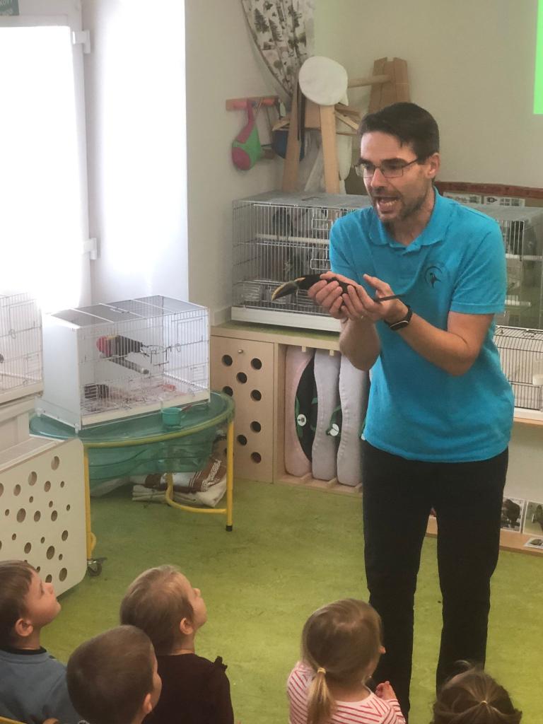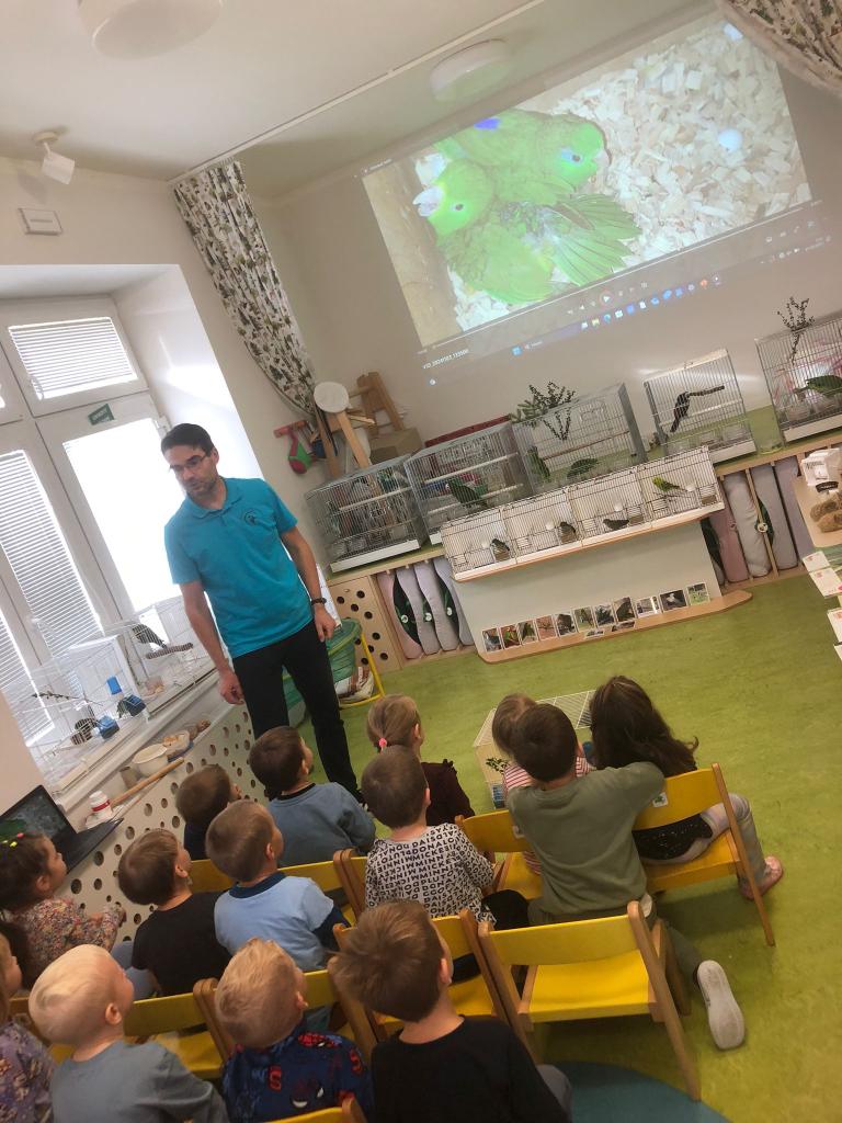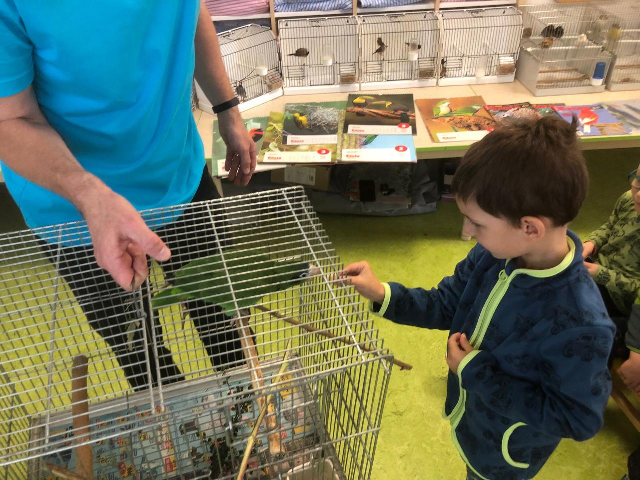 Pan doktor k nám zavítal, aby dětem přiblížil svět převážně exotických ptáků. Na začátku programu nám představil druhy, které přivezl s sebou v klecích – například papoušky, rýžovníky, chůvičky, zebřičky, hrdličky a další. Vyprávěl o jejich způsobu života, potravě, rozmnožování, hnízdění i o zajímavostech z jejich chovu.
