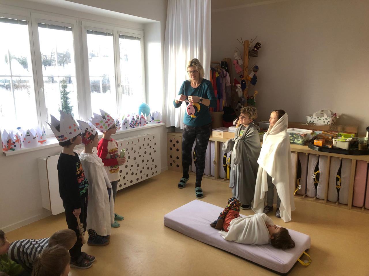 V hudebních činnostech jsme nacvičovali píseň My tři králové. Dramatizací jsme znázornili cestu Tří králů k Ježíškovi se všemi dary.