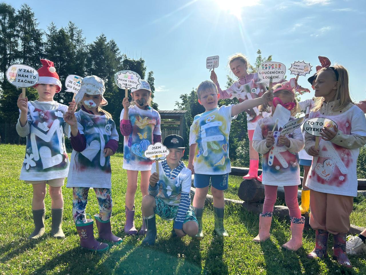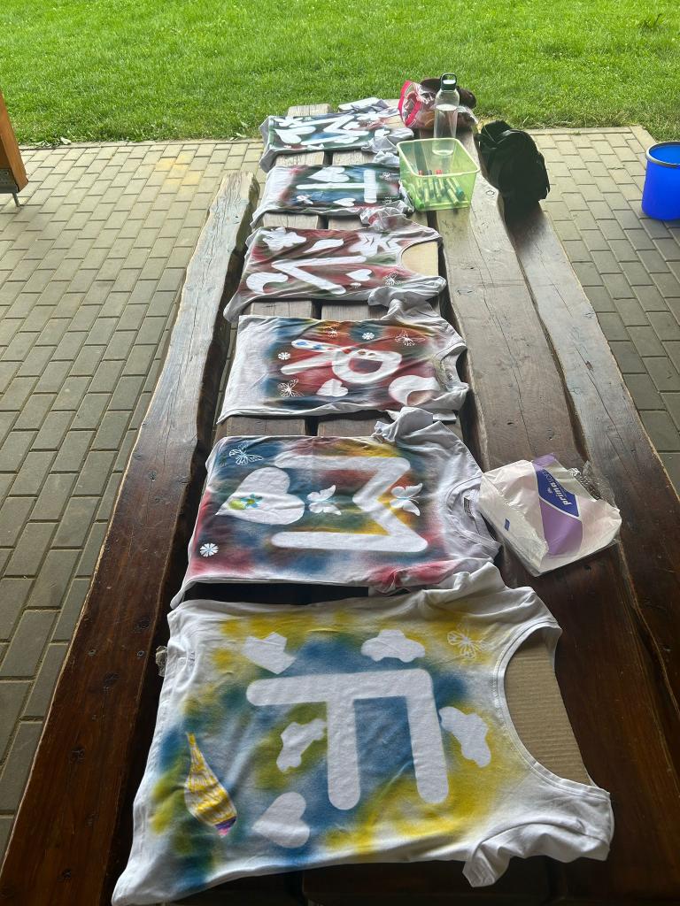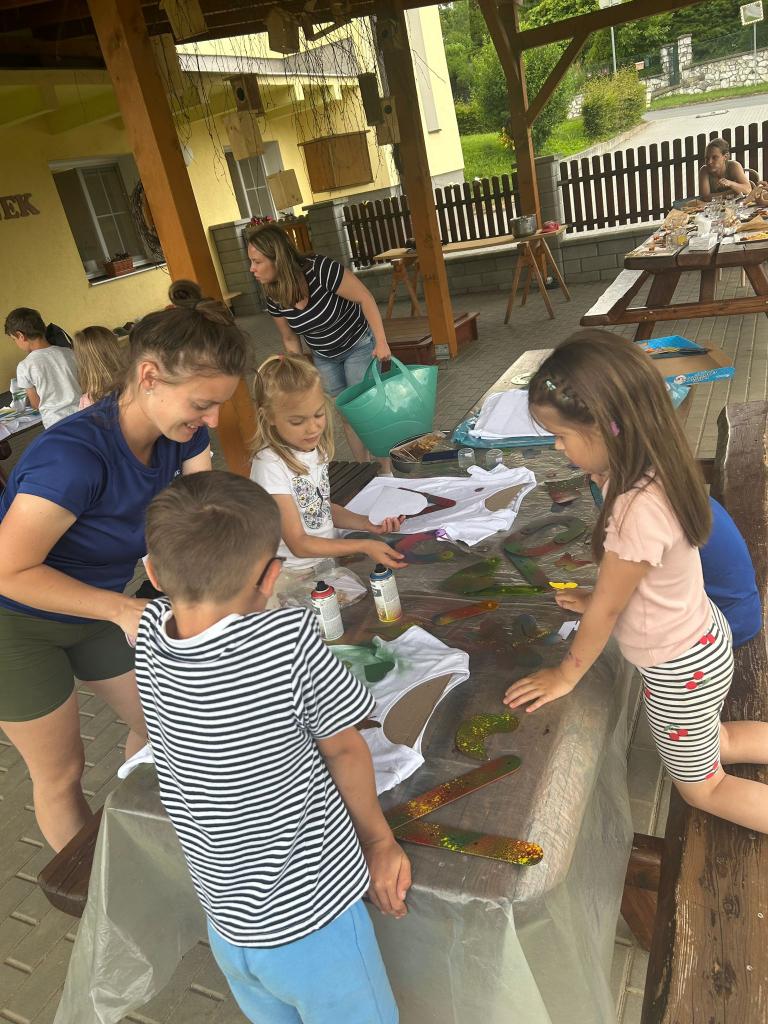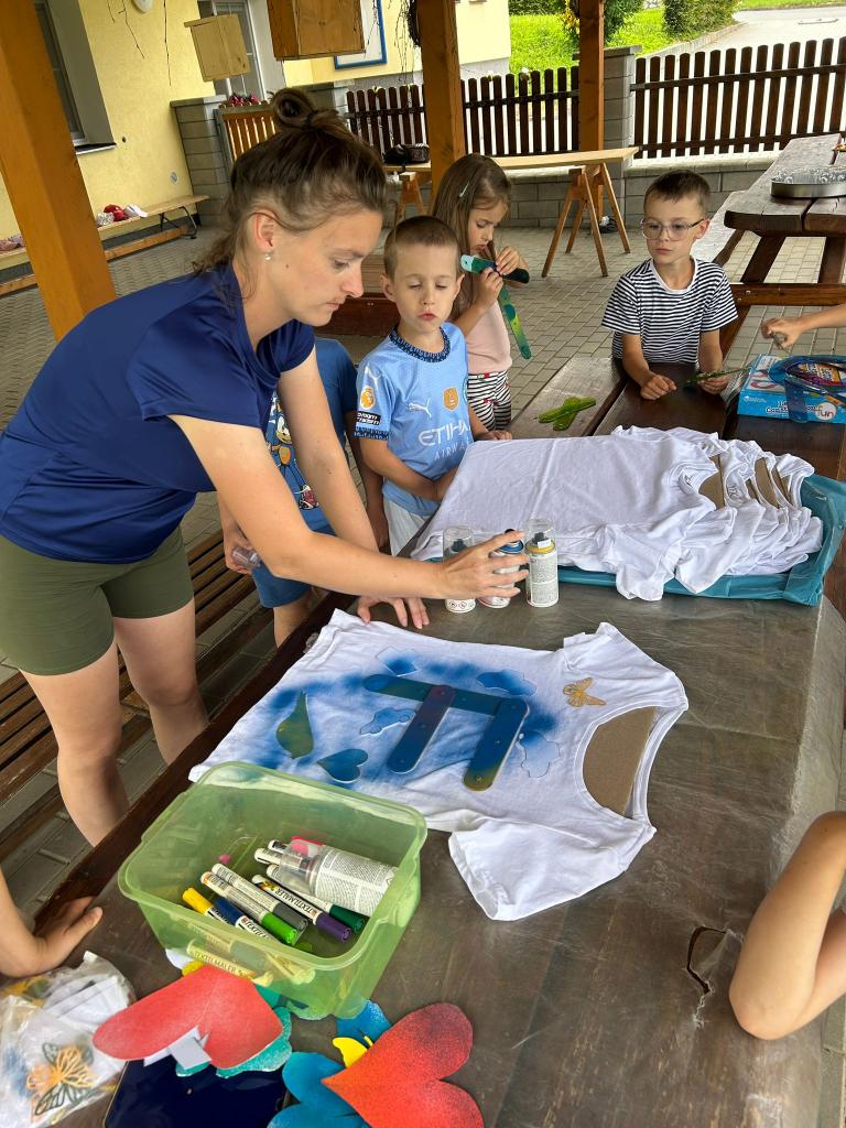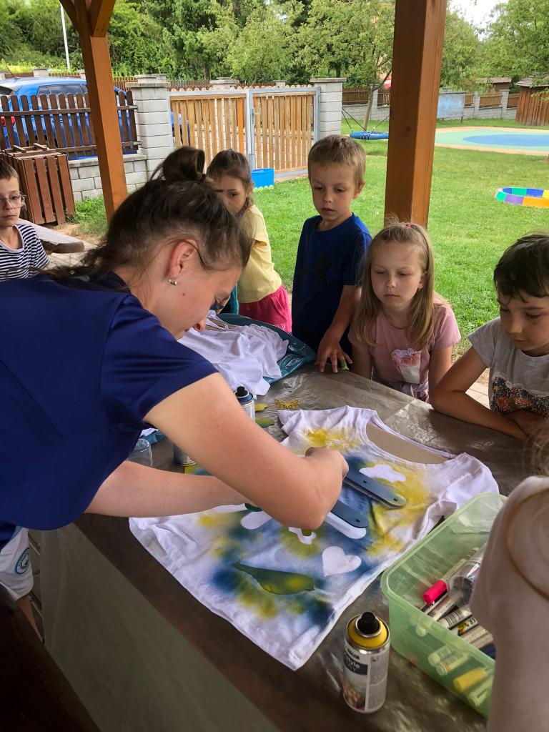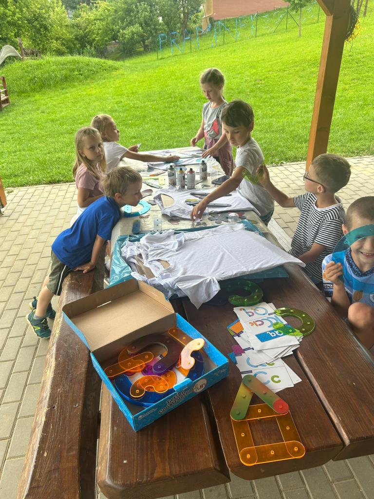Odpoledne pokračovalo tvořivě – děti si vyrobily vlastní památeční tričko - naskládaly si šablony podle fantazie a poté se tričko postříkalo textilními barvami. Ráno každý předškolák dostal odznak na památku, který jim bude připomínat tento výjimečný zážitek.