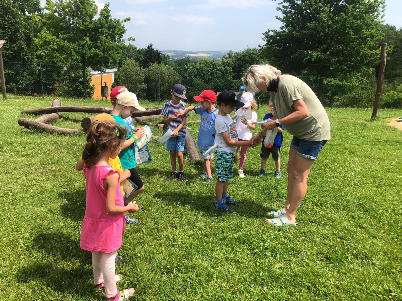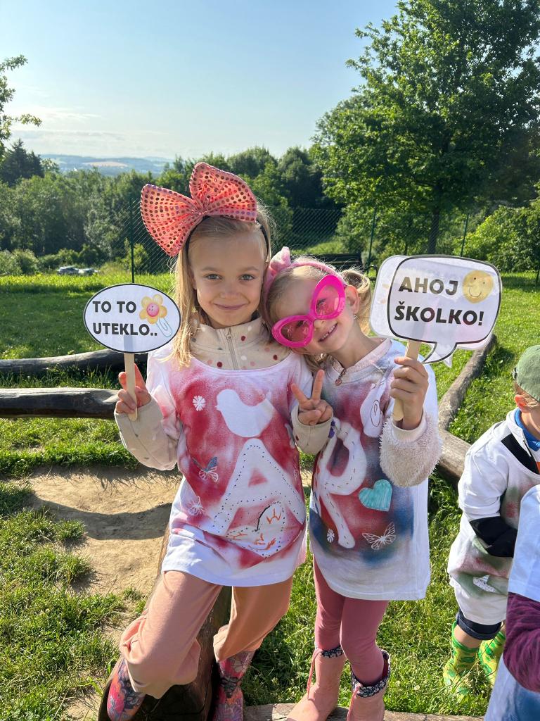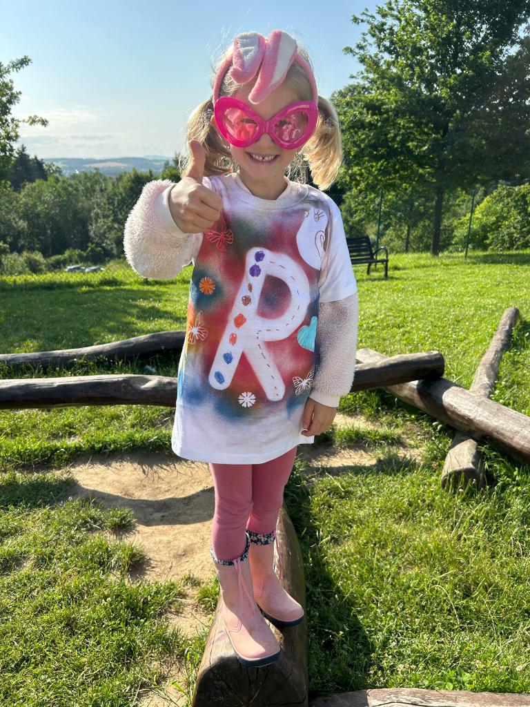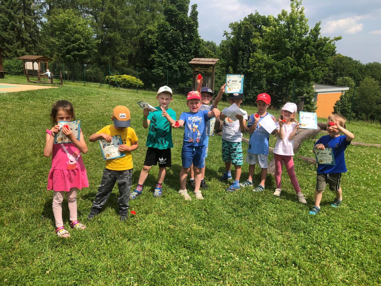 Odpoledne pokračovalo tvořivě – děti si vyrobily vlastní památeční tričko - naskládaly si šablony podle fantazie a poté se tričko postříkalo textilními barvami. Ráno každý předškolák dostal odznak na památku, který jim bude připomínat tento výjimečný zážitek.