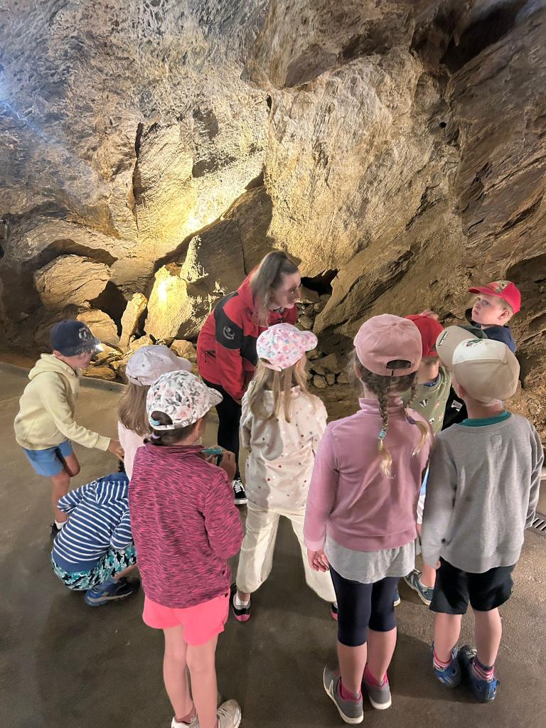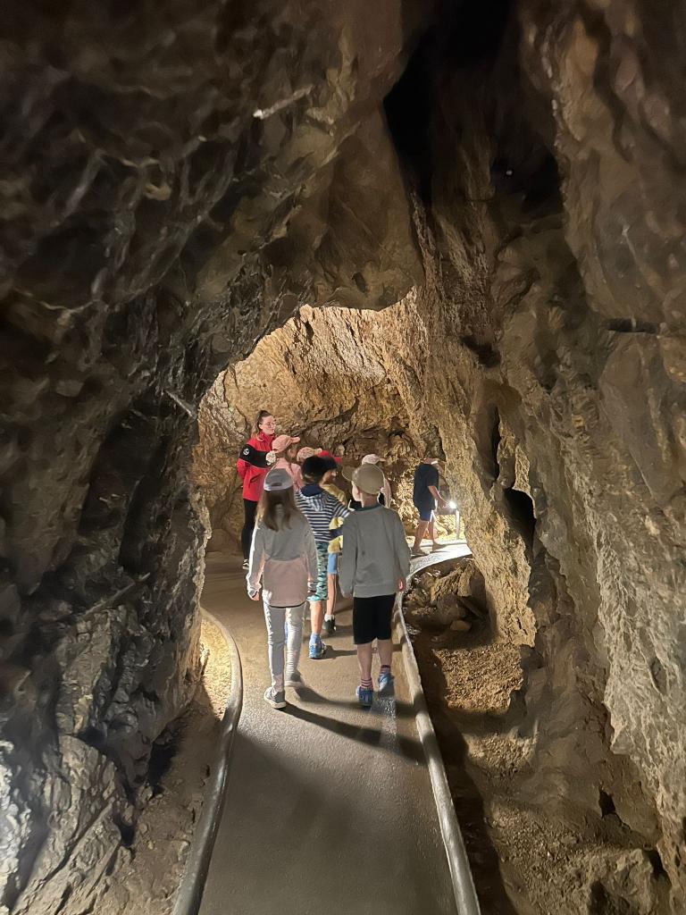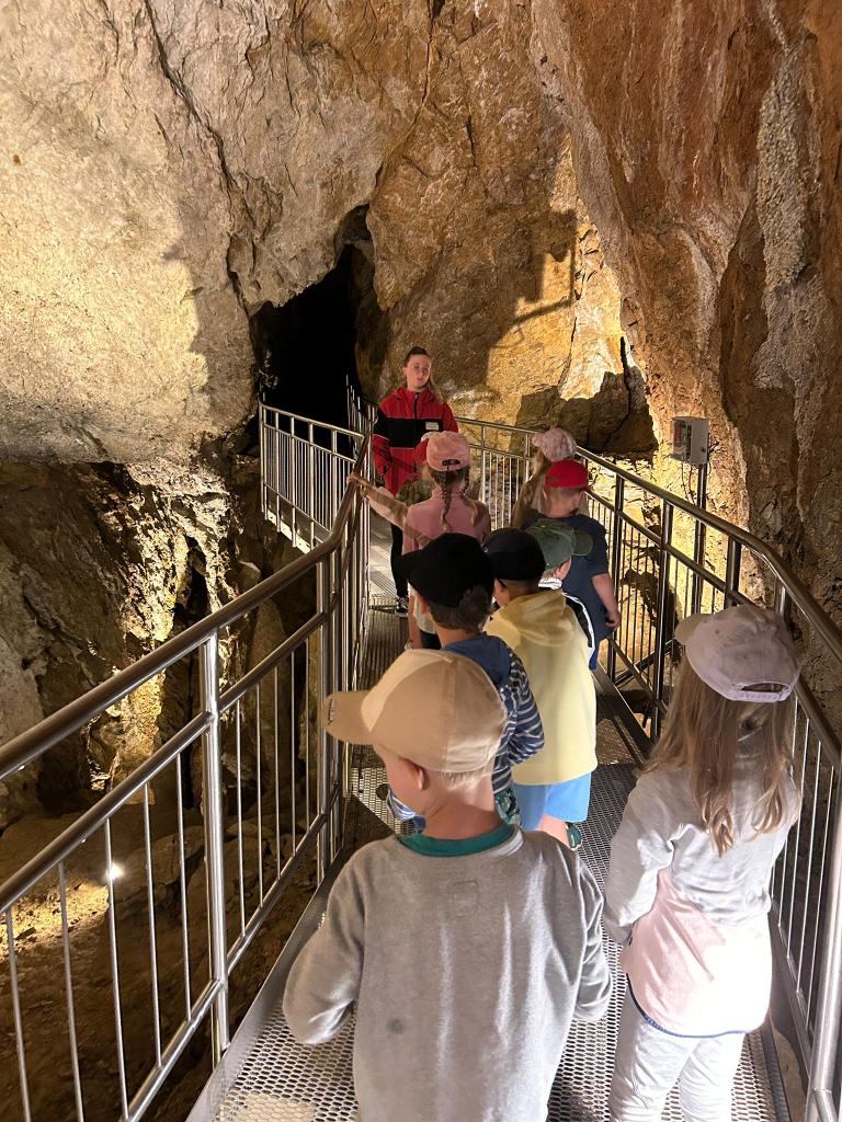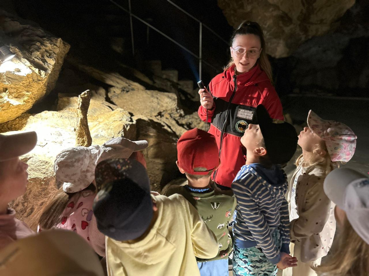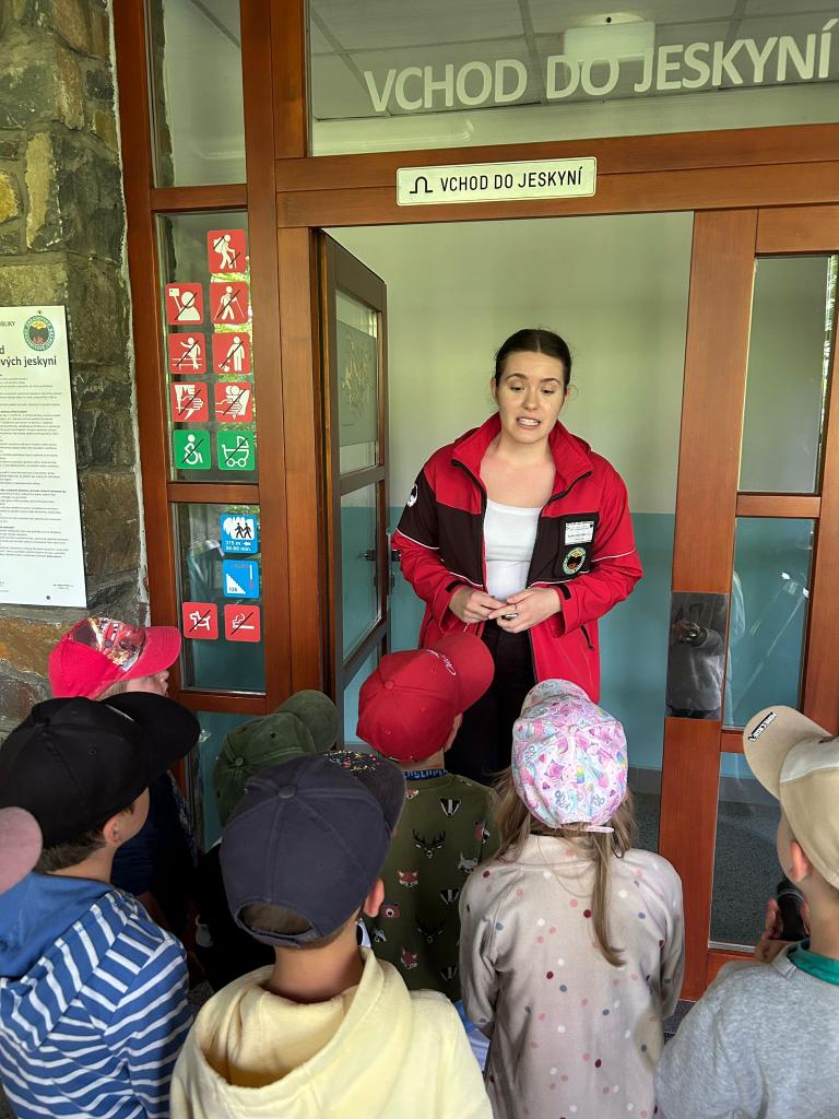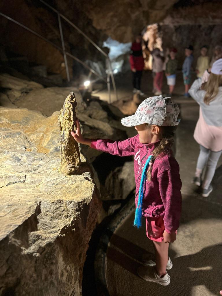 Po svačině nás čekalo milé překvapení – pan Horňáček přivezl pro všechny děti nanuky, které přišly vhod jako osvěžení. Poté jsme společně vyrazili na výlet do místních Zbrašovských jeskyní, kde děti objevovaly tajemství podzemního světa a užily si dobrodružnou atmosféru. Velmi poutavou formou nás provedla paní průvodkyně Adélka. Nejvíce se dětem líbila situace, kdy paní průvodkyně zhasla v celé jeskyni a děti měly možnost vidět jeskyni přesně tak jako její první objevitelé.