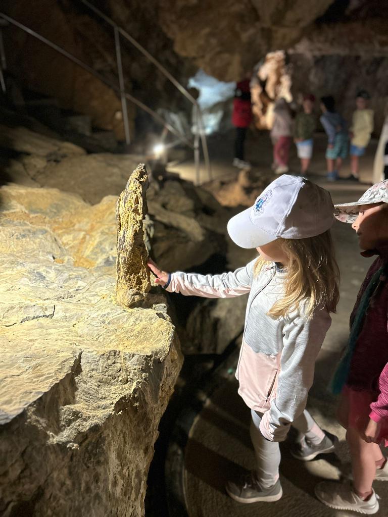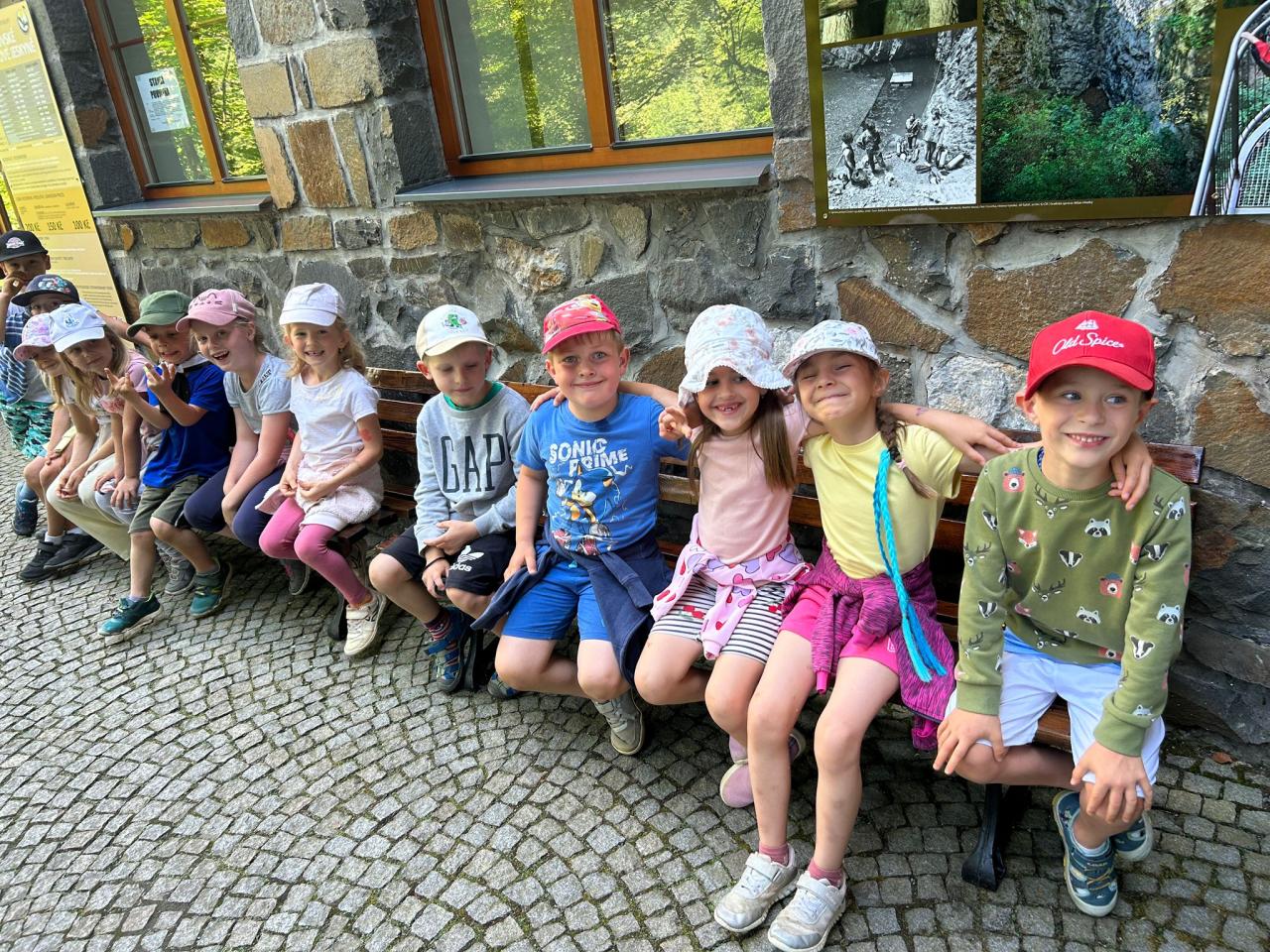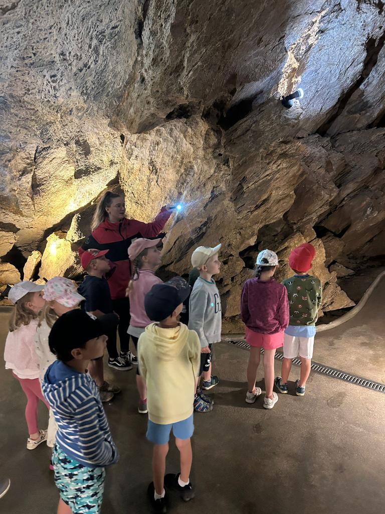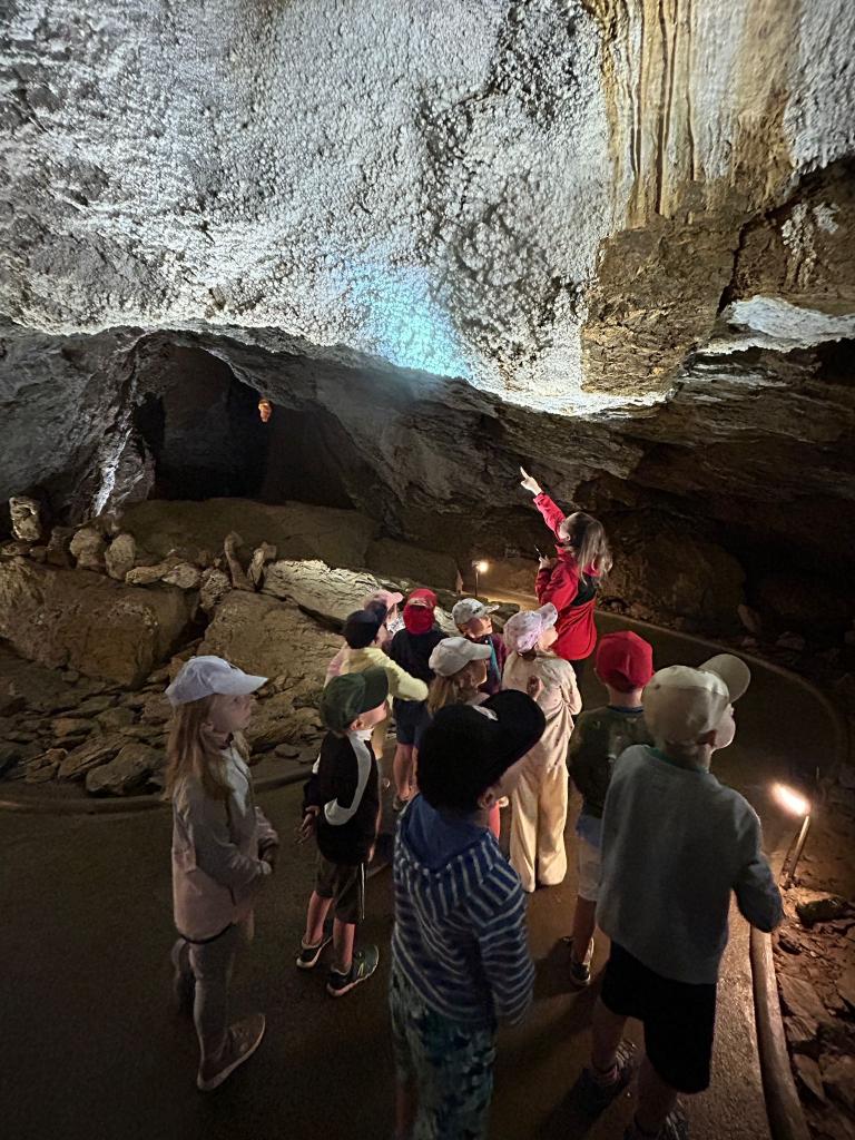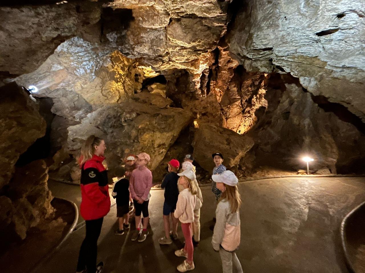 Po svačině nás čekalo milé překvapení – pan Horňáček přivezl pro všechny děti nanuky, které přišly vhod jako osvěžení. Poté jsme společně vyrazili na výlet do místních Zbrašovských jeskyní, kde děti objevovaly tajemství podzemního světa a užily si dobrodružnou atmosféru. Velmi poutavou formou nás provedla paní průvodkyně Adélka. Nejvíce se dětem líbila situace, kdy paní průvodkyně zhasla v celé jeskyni a děti měly možnost vidět jeskyni přesně tak jako její první objevitelé.
