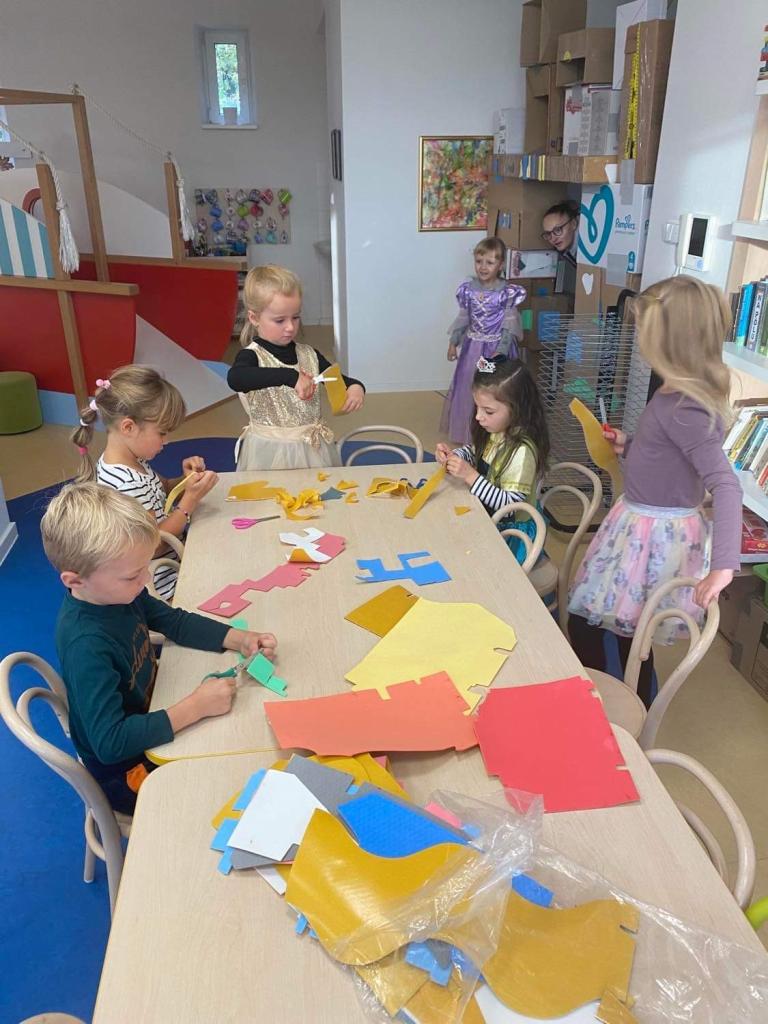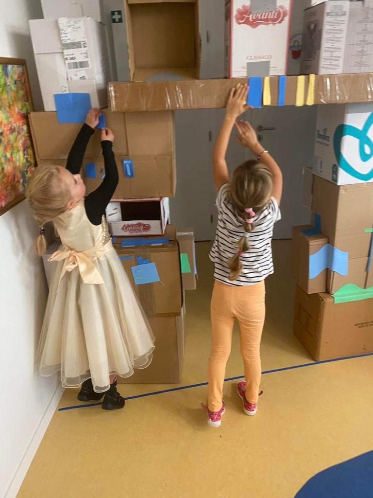 Ve třídě MŠ děti vytvářely kolektivní dílo v podobě hradního opevnění. Na zdobení fasády jsme využili různorodého materiálu - odpadový materiál, balící papír, oboustranné barevné pásky a plata od vajec.