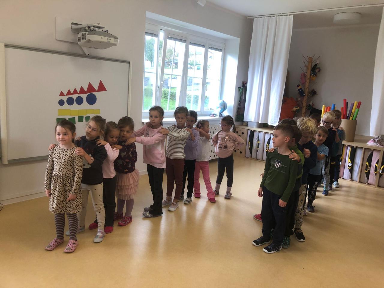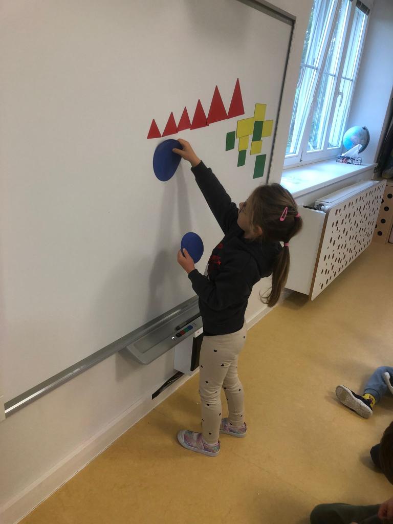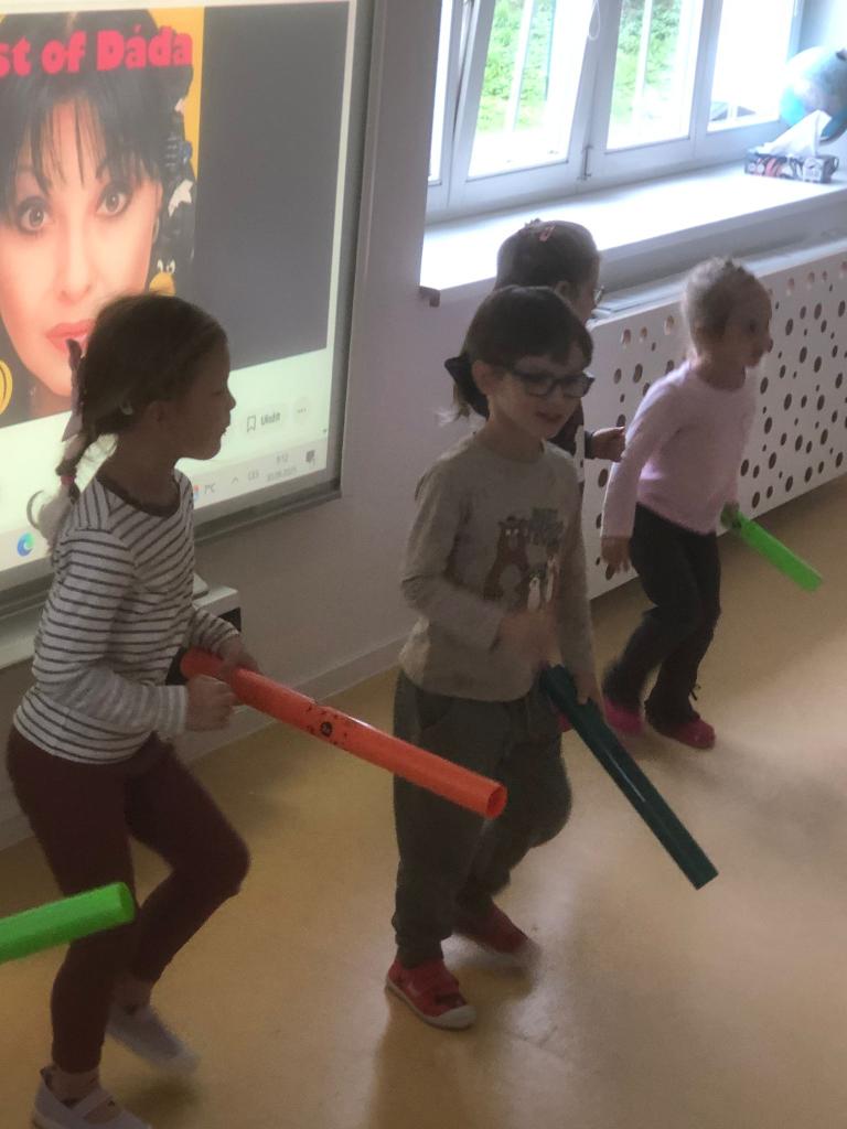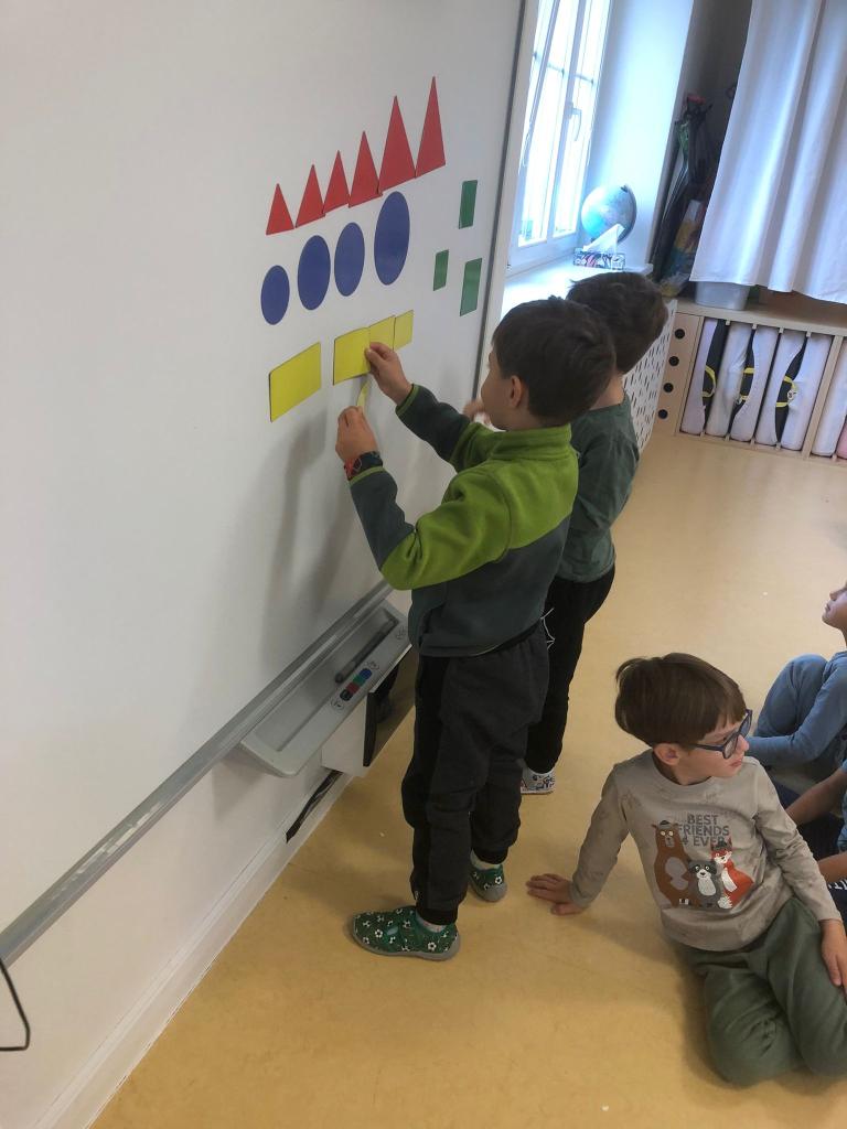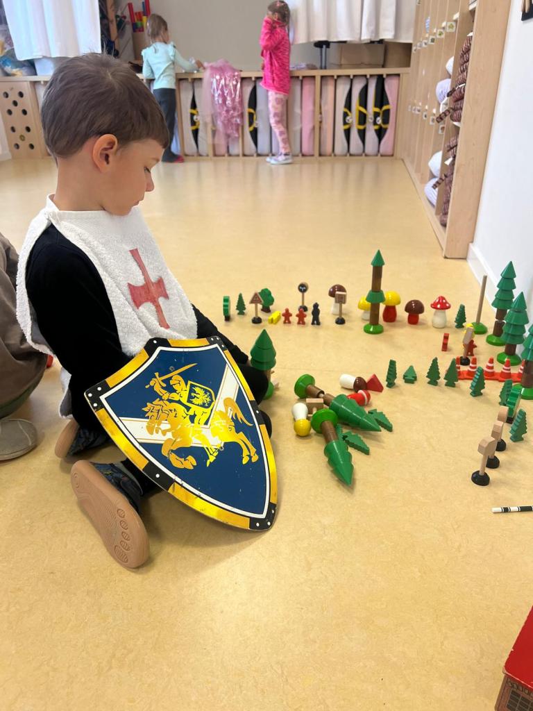 Ve třídě děti vytvářely kolektivní prostorovou práci v podobě hradního opevnění a zazpívaly si píseň To je kopec, to je hrad.