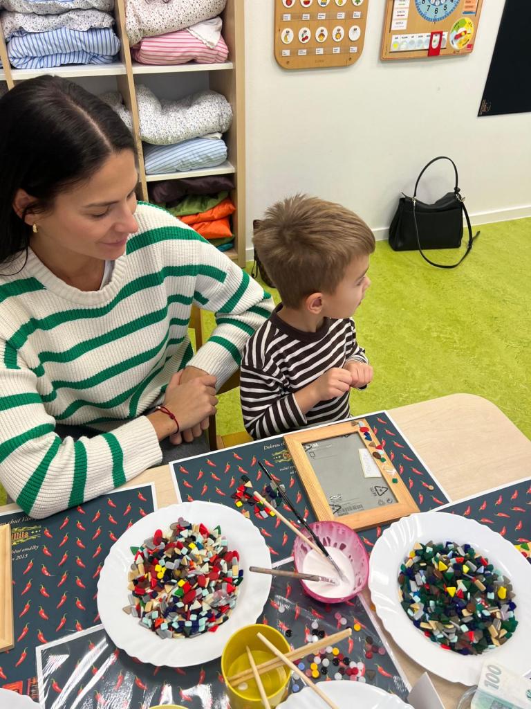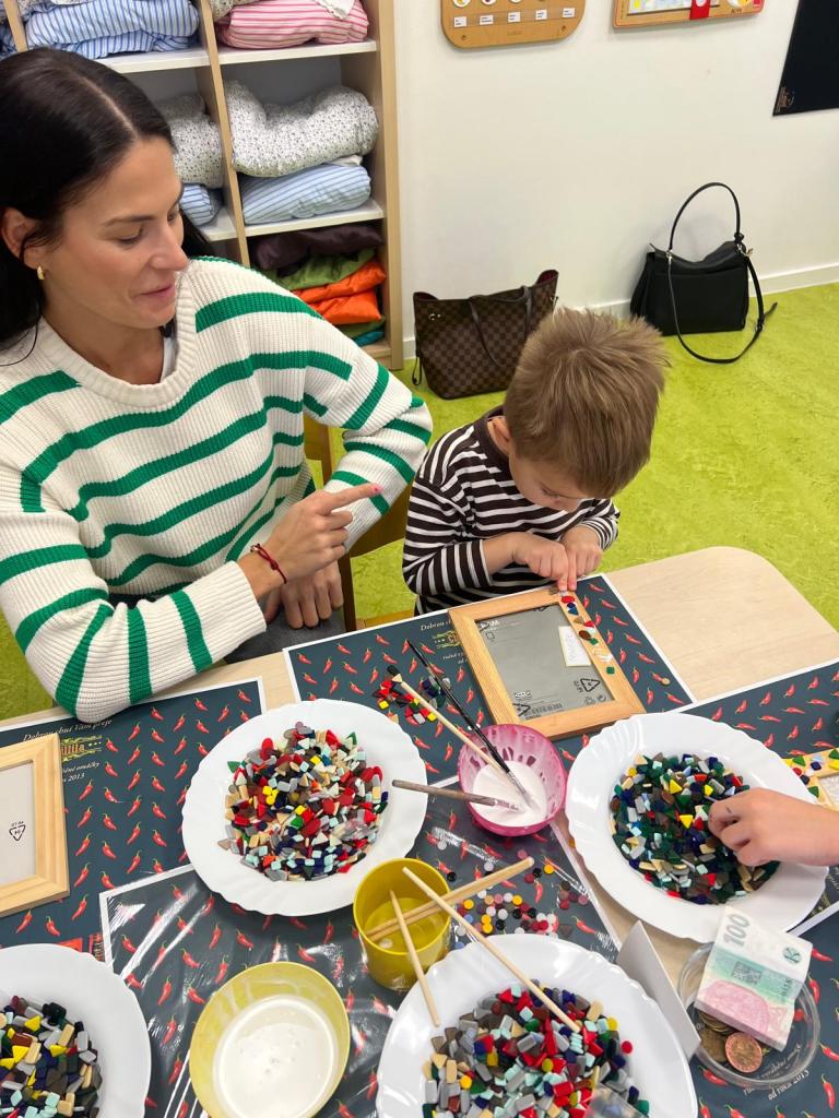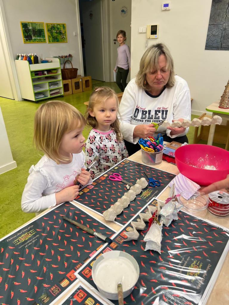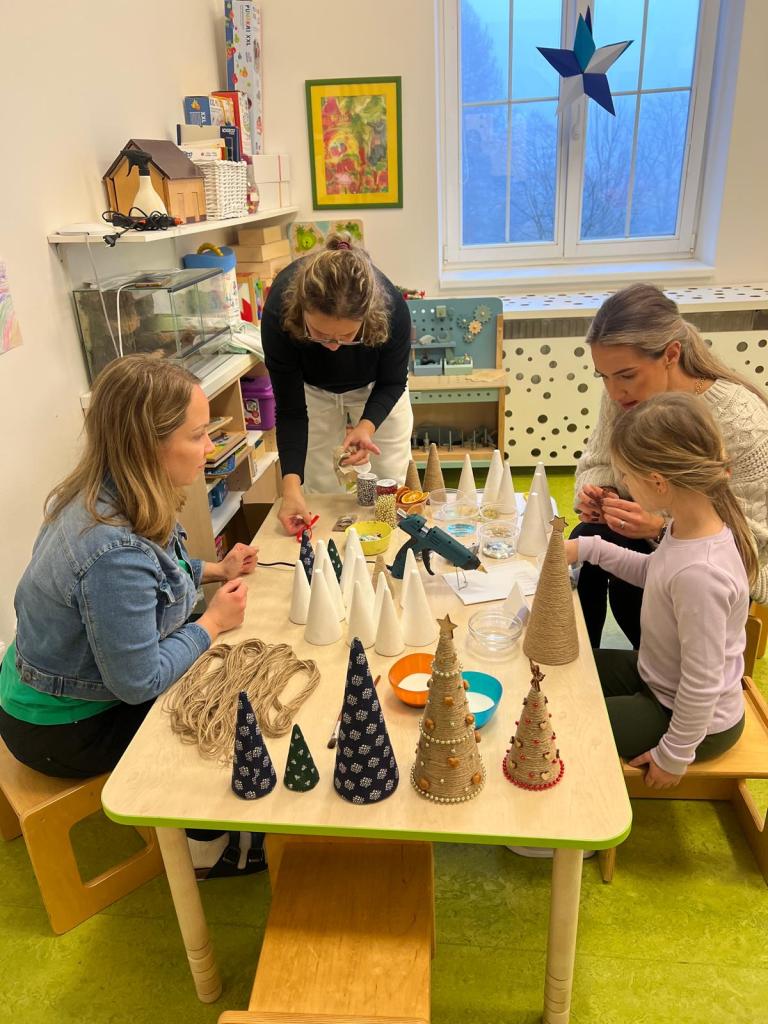 V předvánočním čase se v naší mateřské škole uskutečnily vánoční dílničky, které proběhly v příjemné a tvořivé atmosféře. Děti společně s rodiči a prarodiči vyráběly rozmanité vánoční dekorace a drobné dárky. Vznikaly stromečky omotané provázkem, papírové vánoční hvězdy, perličkové ozdoby i originální plátěné tašky zdobené bramborovými tiskátky. Velký úspěch měla také mozaika na fotorámečcích.