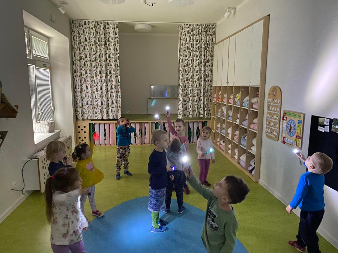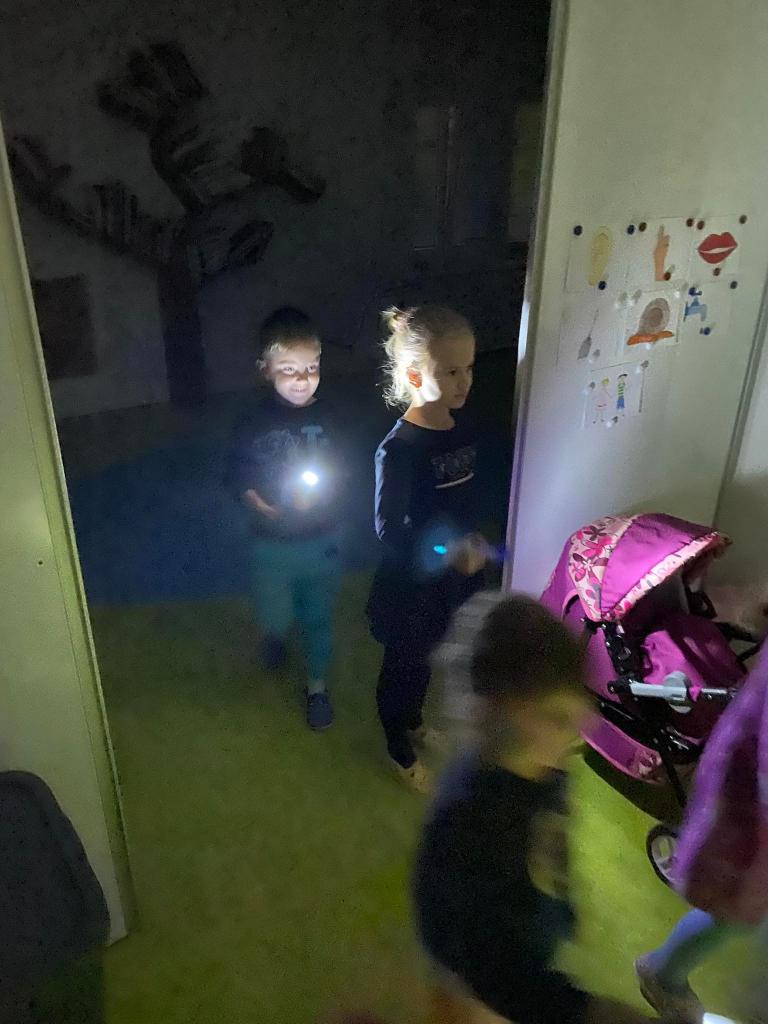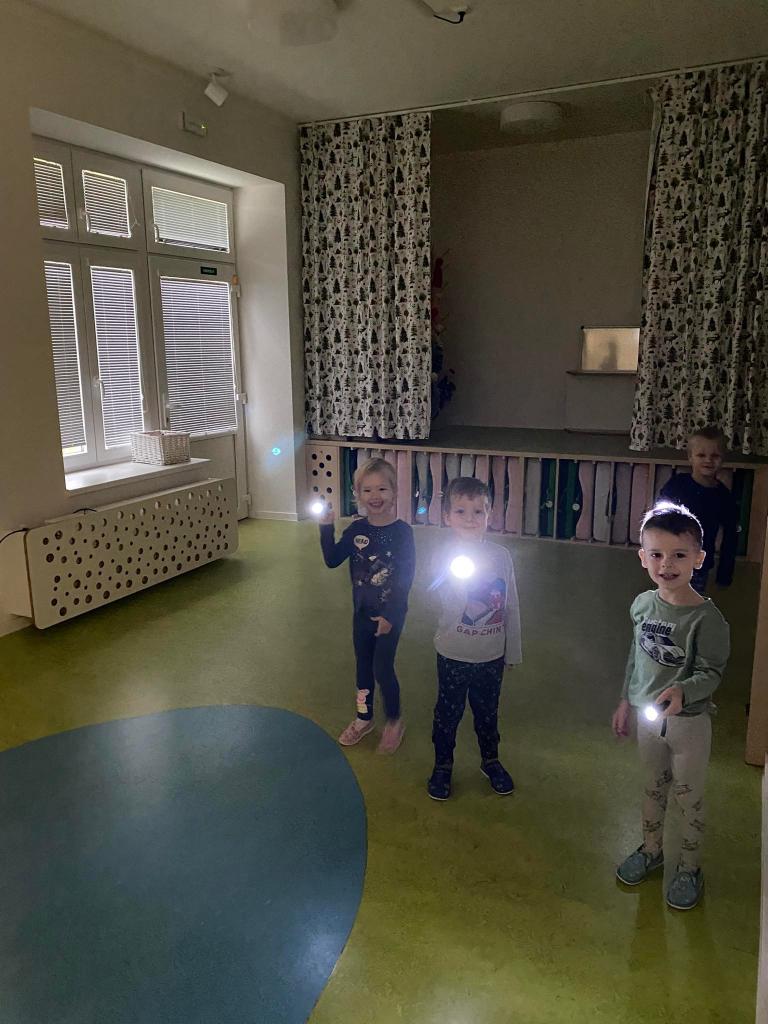 V rámci tématu jsme pracovali s příběhem-Jak se měsíc urazil. Prostřednictvím příběhu děti získávaly povědomí o střídání dne a noci, o síle Slunce a Měsíce. Dozvěděli jsme se, jakým způsobem se ve tmě orientujeme (světlo, svíčka, baterka) a co nám svítí na cestu při noční obloze. Děti si vyzkoušely pohyb ve tmě, měly možnost si posvítit baterkami. Následně jsme vytvářeli světelné efekty, stínové divadlo a také jsme vytvořili hvězdnou oblohu. Bylo rozvíjeno smyslové vnímání při zkoumání předmětů hmatem.