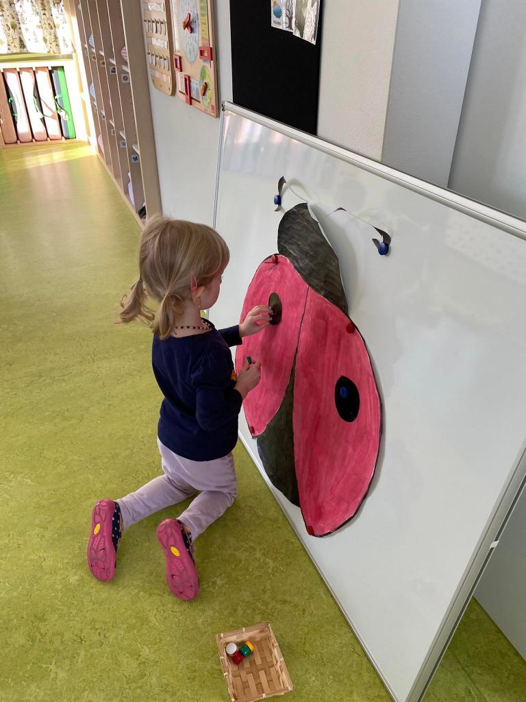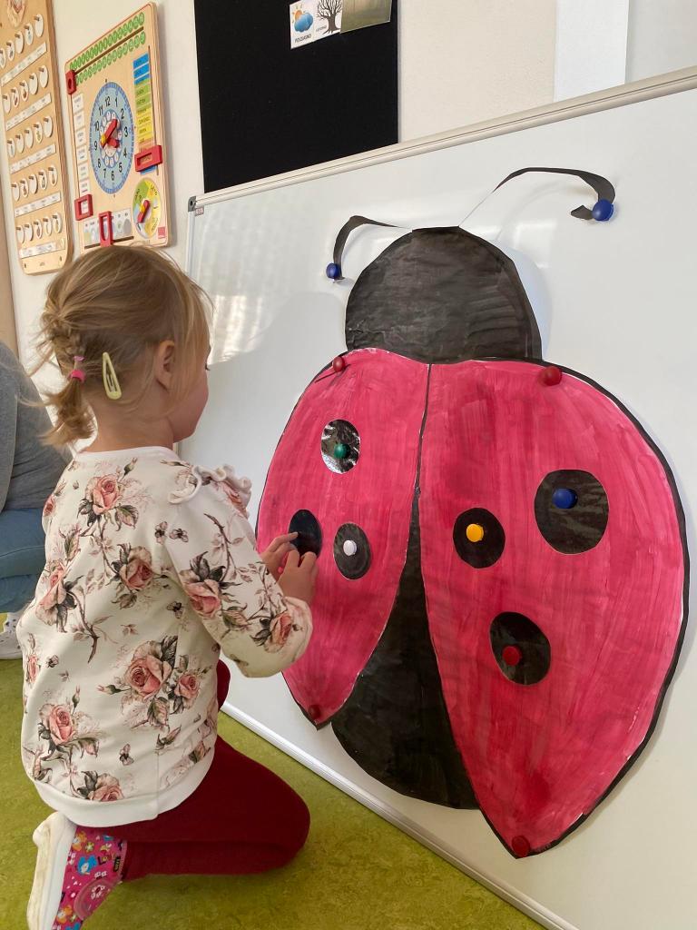 Byla rozvíjena matematická pregramotnost – hledání ztracených teček berušky, počítání, porovnávání, pojmy více/méně, větší/menší.