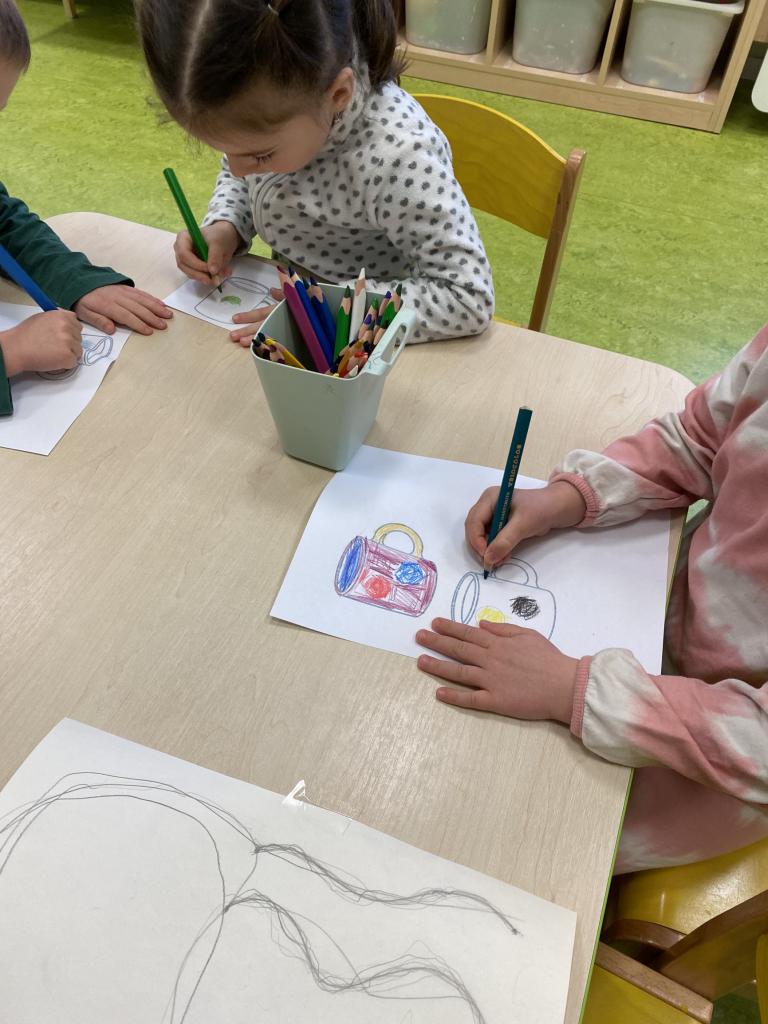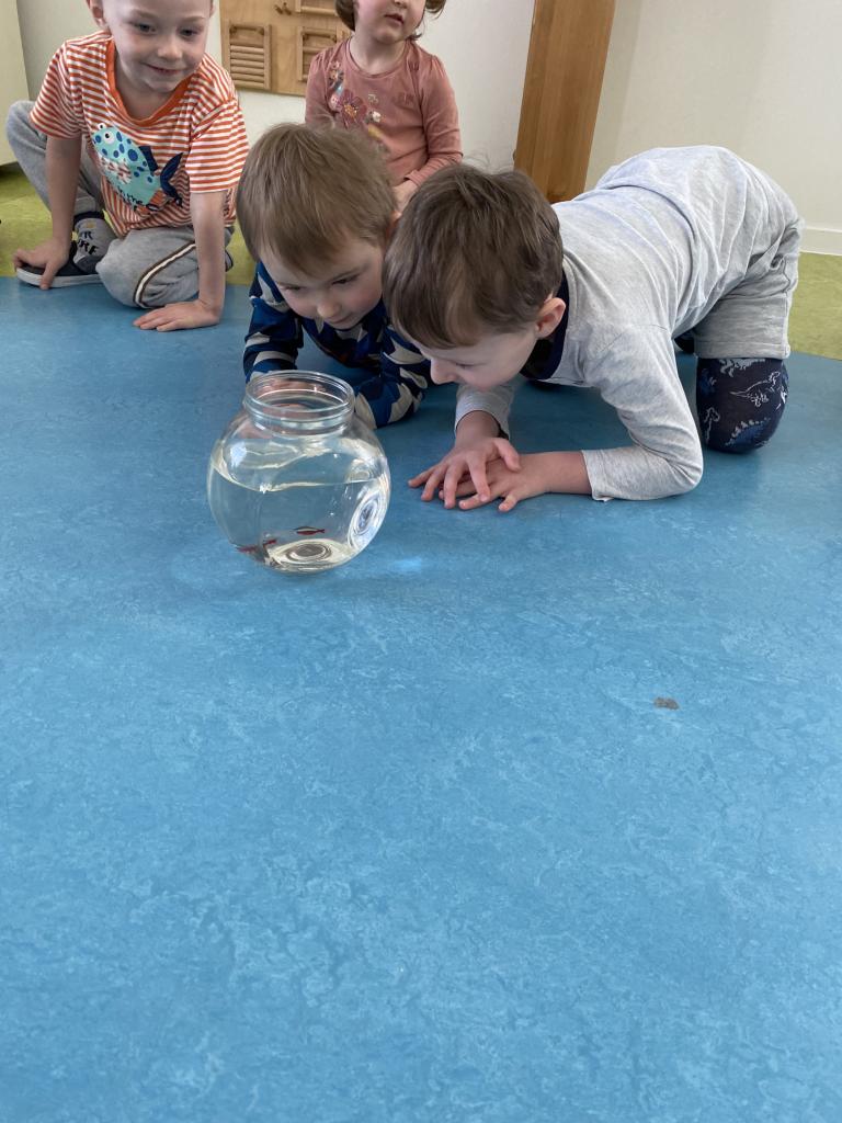 Dále jsme rozvíjeli orientaci v prostoru (pojmy-nad, pod, za, před, vpravo, vlevo, na, hledání prstenu, korálků ve třídě), smysly-chuť (voda sladká, slaná, kdyselá), jemnou motoriku (navlékání korálků), předmatematické dovednosti (počítání/porovnávání ryb), znalosti a slovní zásobu (poznávání vodních živočichů, ekologie).